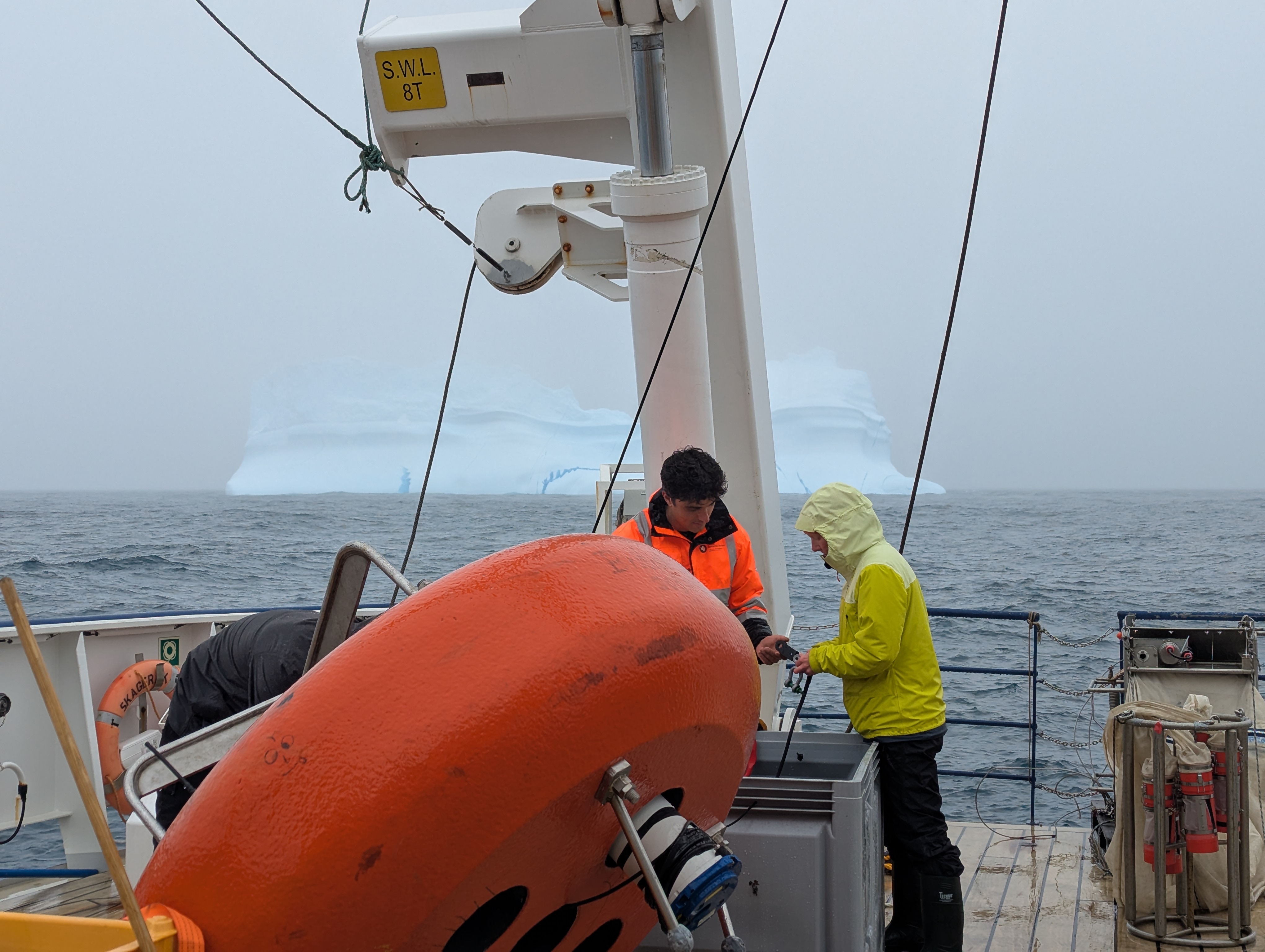 Today the sun is gone. We spent the day crawling through thick fog and dodging huge icebergs (very slowly!). As we write this in the mess (the dining area), the ship is rolling on a rough sea. Today the morning shift deployed CTDs, nets, and took water samples across the mouth of Kangerlussuaq fjord again to see if the recent storm has affected the water properties that enter the fjord. The afternoon shift prepared the mooring for deploying tomorrow, by attaching instruments to the rope in the pouring rain and fog while we passed by massive icebergs.