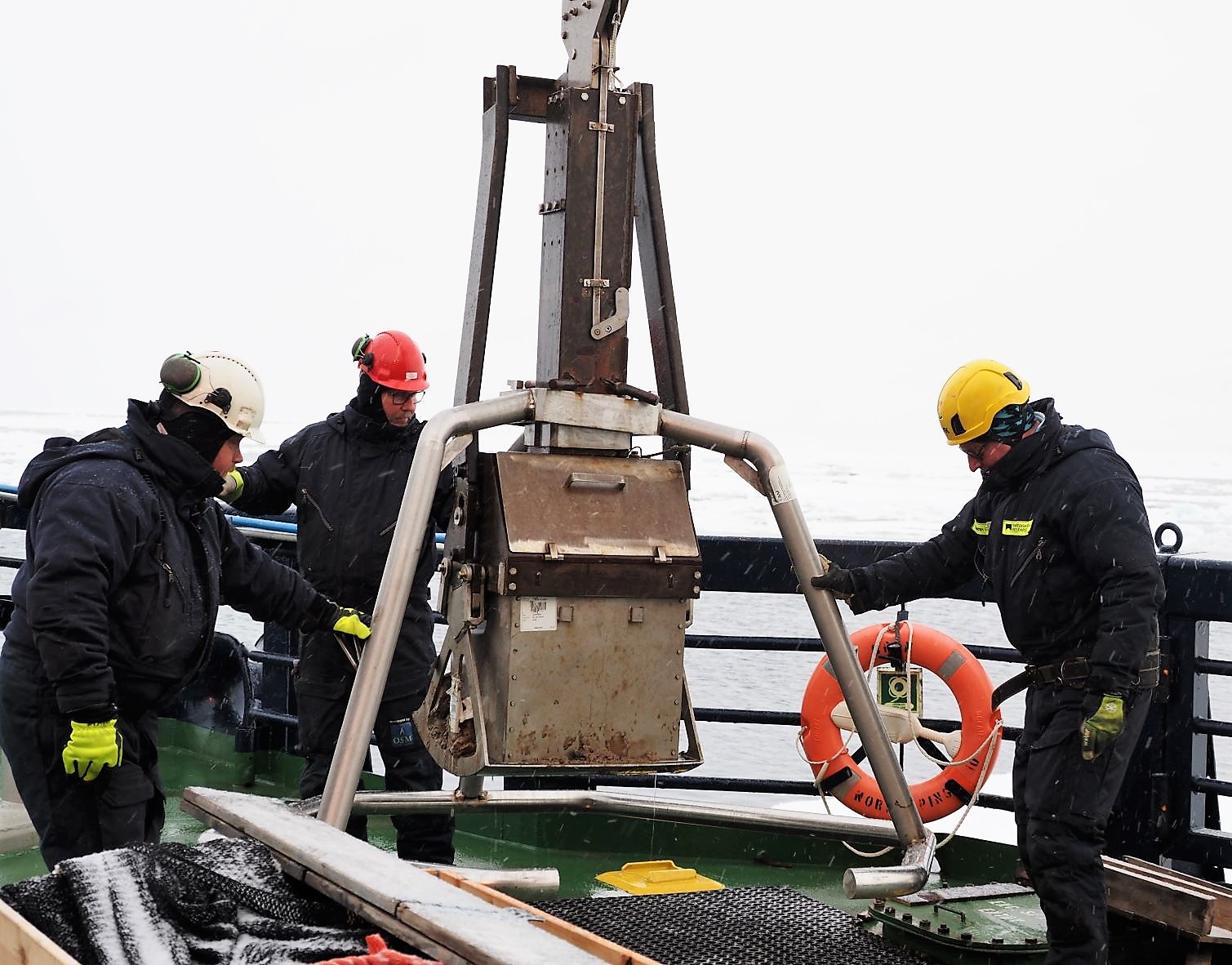 Så fort sista bottenhugget var gjort började förberedelser för gång i öppet vatten mot Sverige. Odens nya gula, snabbgående räddningsbåt sjösäkras på akterdäck. Foto: Maria Samuelsson