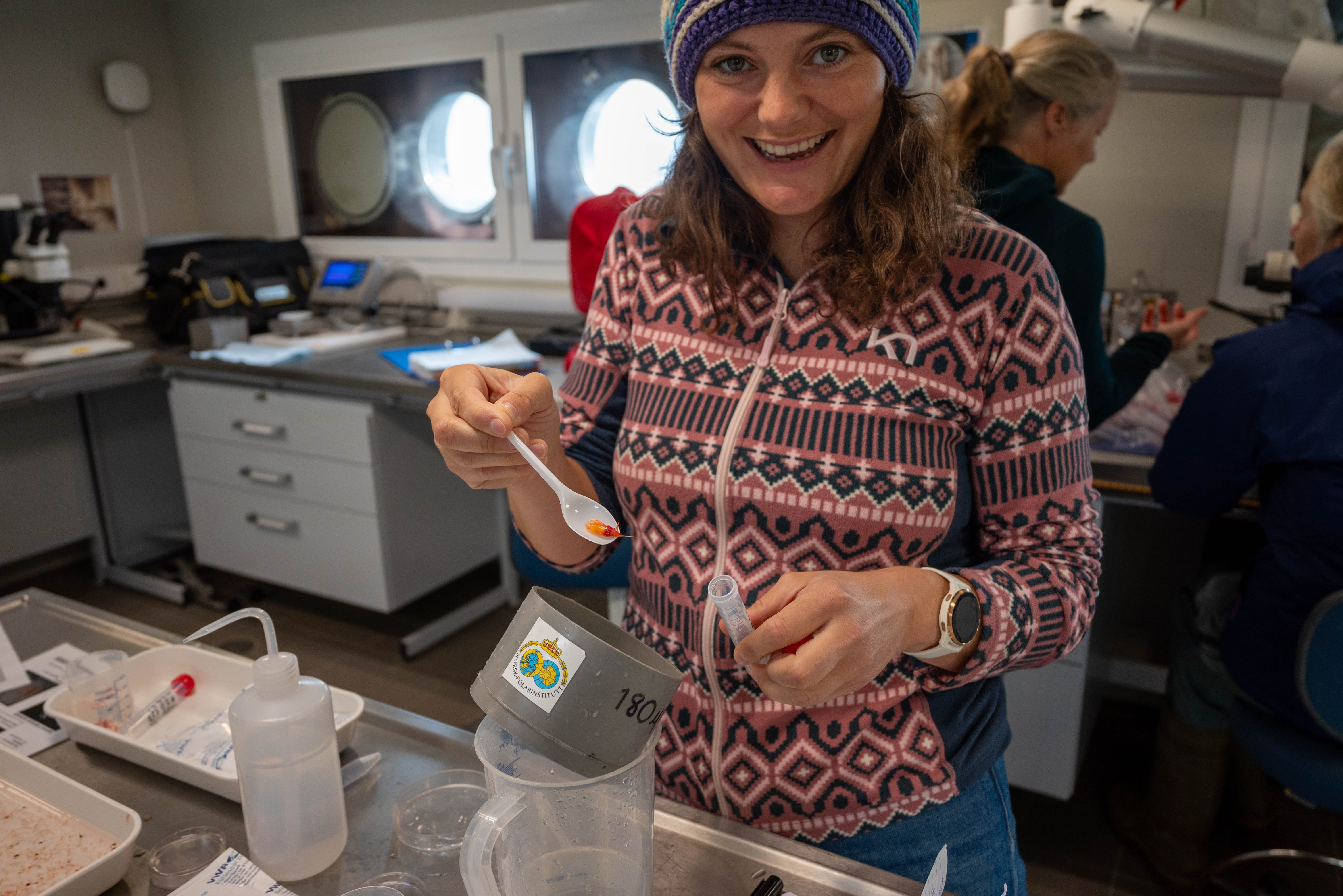 – RV Kronprins Haakon är ett fantastiskt fartyg. Den är väldigt modern och har nästan allt man kan önska sig. Att ta prover på kvicksilver i havsvatten är lite knepigt eftersom det finns i spårhaltiga koncentrationer. Jag är därför väldigt glad att jag har ett labb för mig själv ombord där jag kan bearbeta mina prover på ett rent sätt. Livet ombord är riktigt trevligt. Vi har god mat, mycket grönsaker och till och med färsk sallad dagligen. Vi har gym, bastu, bordtennis, badminton, massagestol, massor av spel och många andra trevliga aktiviteter ombord. Det är en blandad grupp av människor från alla stadier av karriären, olika vetenskapliga bakgrunder och från olika länder runt Arktis. Det är en fantastisk upplevelse att vara en del av den här gruppen och höra allas berättelser.