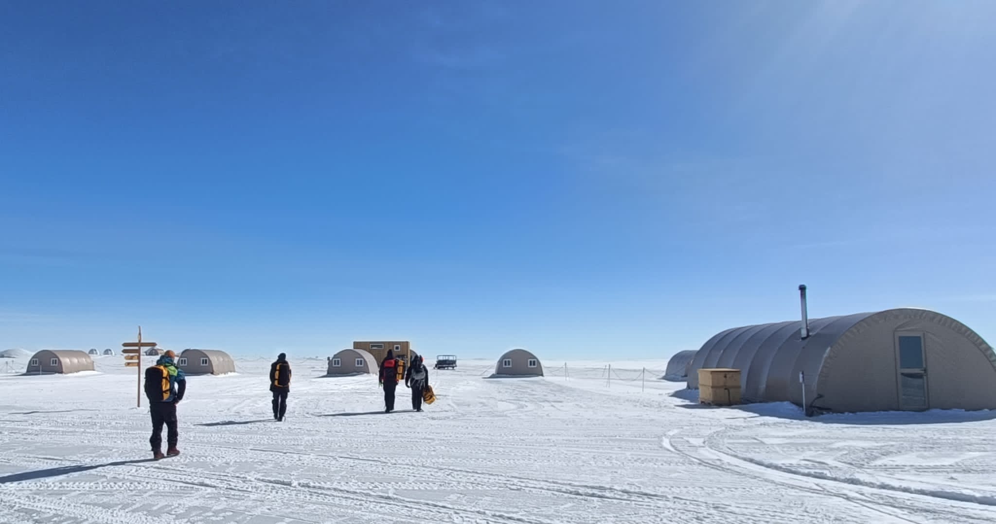 Tyvärr så kunde vi inte flyga vidare till vår svenska station på grund av sämre väder längs den flygrutten. Vi blev i stället inkvarterade i tält och får vänta ut vädret. Just nu blåser det kring 20 m/s och troligen blir vi kvar här någon dag till.