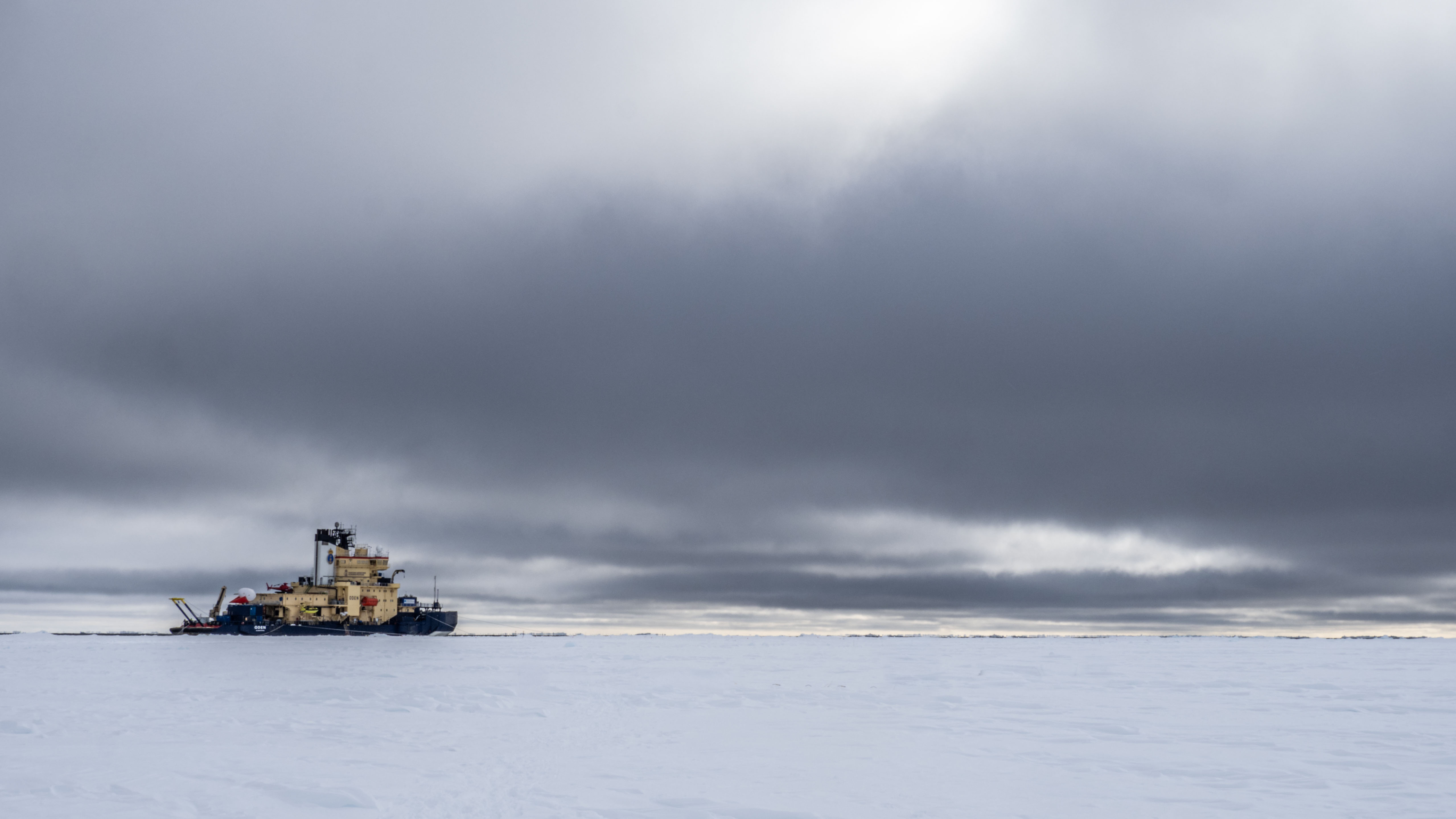 Isbrytaren Oden vid en isstation, med en Helikite flygande från aktern. Foto: Michael Tjernström