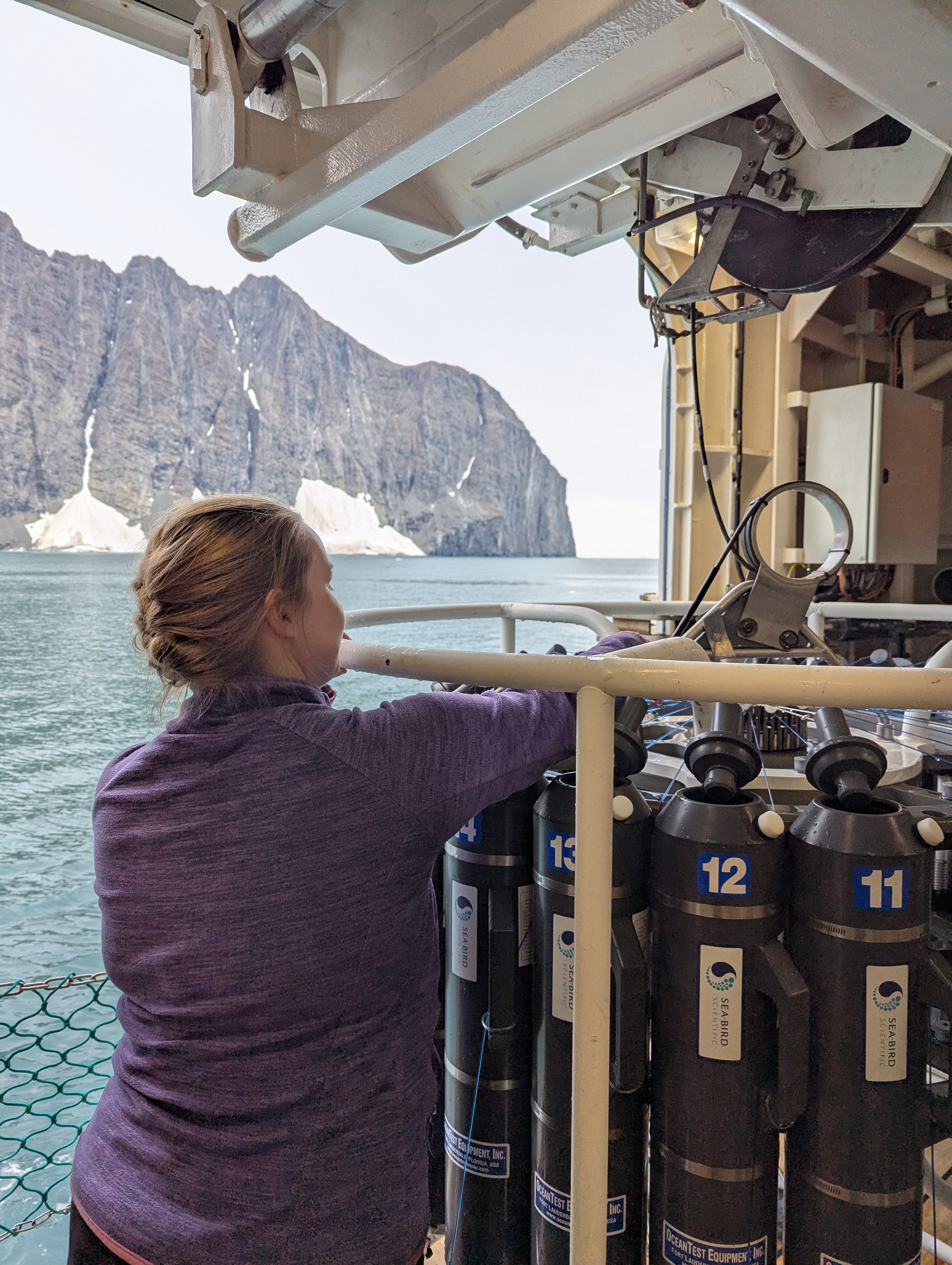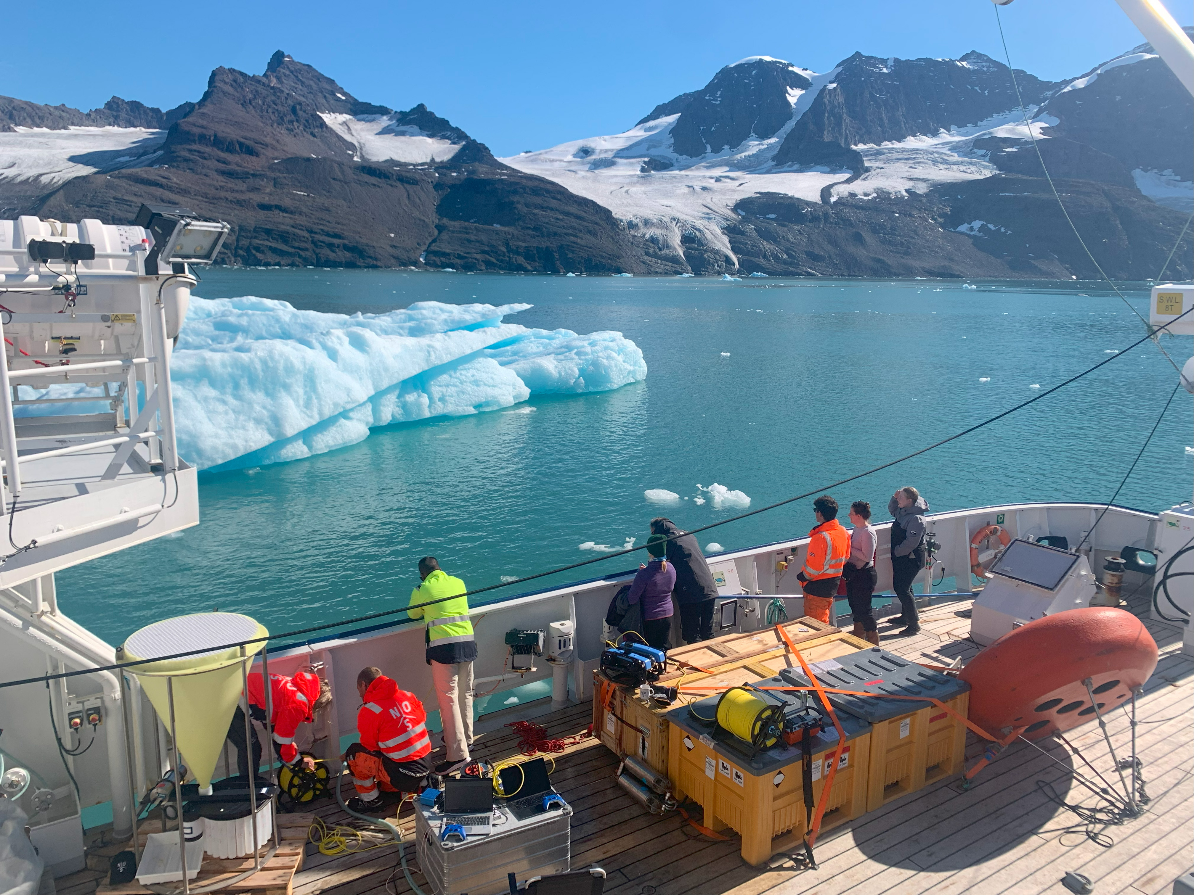 We woke up at the head of a small fjord, filled with blue icebergs and long glaciers winding down the mountains into the sea. We started the day deploying CTDs, and the ECRs reached a big milestone – deploying the CTD solo!