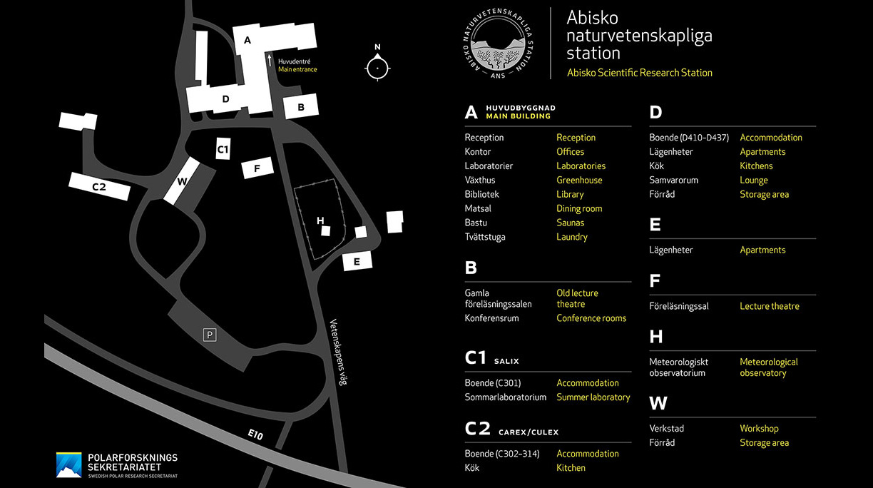 I huvudanläggningen finns laboratorier, kontor, verkstäder, föreläsningssalar, växthus, försöksträdgårdar, lagerlokaler och en meteorologisk station. Utanför stationsområdet finns fem fältstugor på olika platser i Abisko