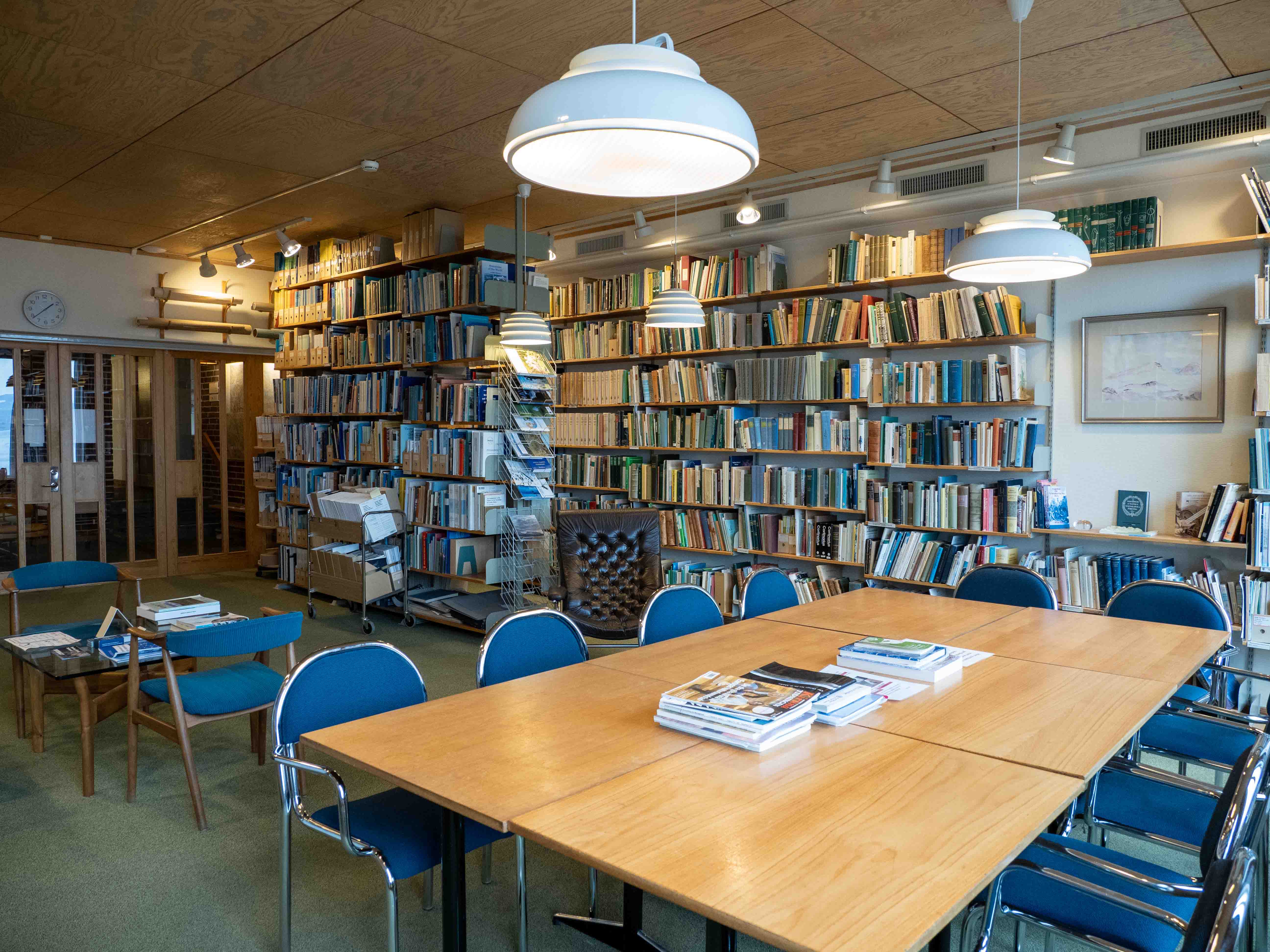 Mindre vetenskapligt bibliotek med fokus på polarområdena. Möjlighet till tyst arbetsyta.