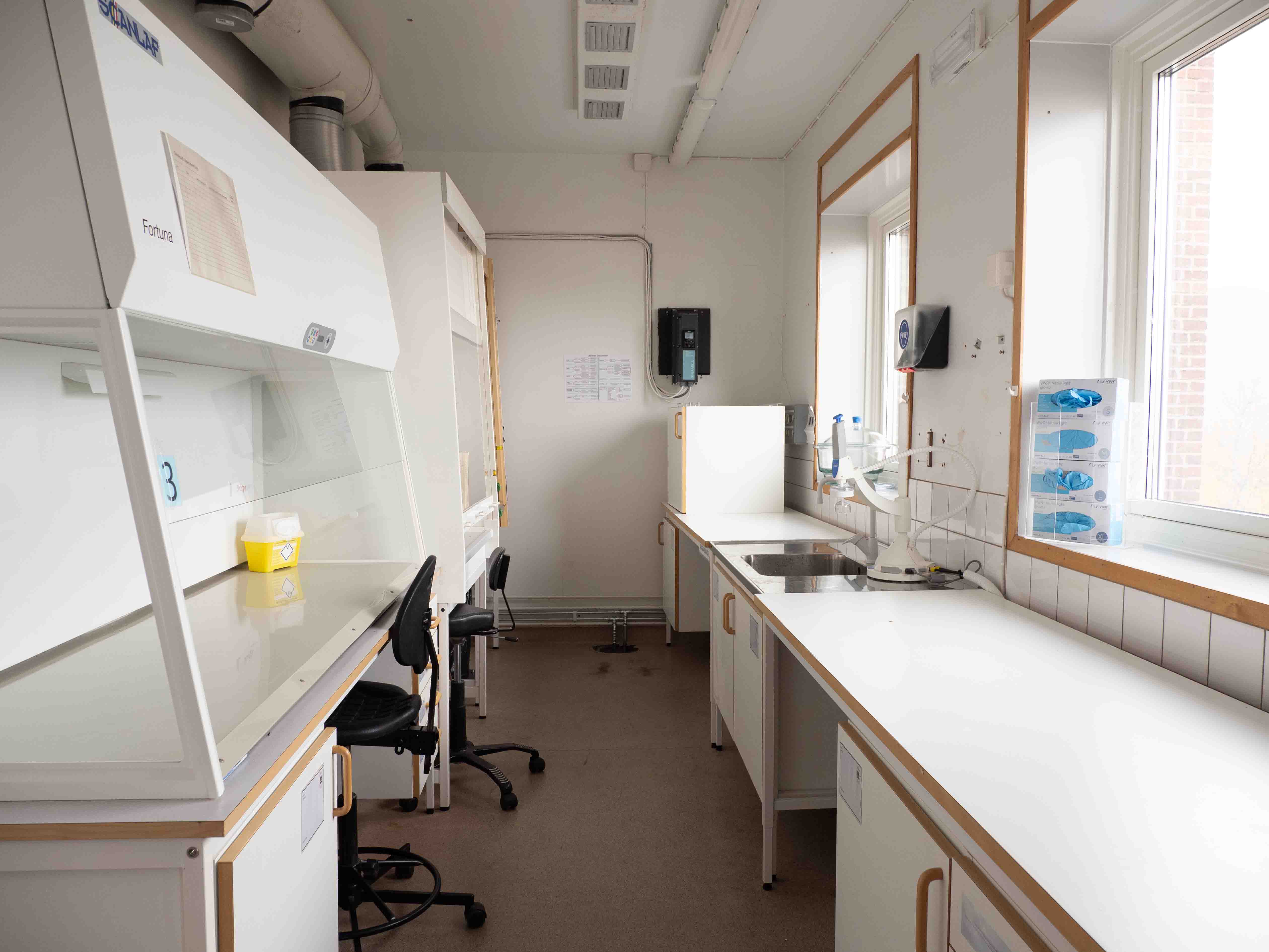 Här får endast arbete med rena och preparerade prov utföras. Detta laboratorium är avsett för arbeten som kräver dragskåp, till exempel vid hantering av starka syror och baser, flyktiga eller toxiska kemikalier eller arbeten som är kontamineringskänsliga. Lokalen är utrustat med två dragskåp och en renluftsbänk. Tillgång till extra ultrarent vatten, samt en diskbänk. Vakuumpump kan lånas till vissa typer av arbeten.