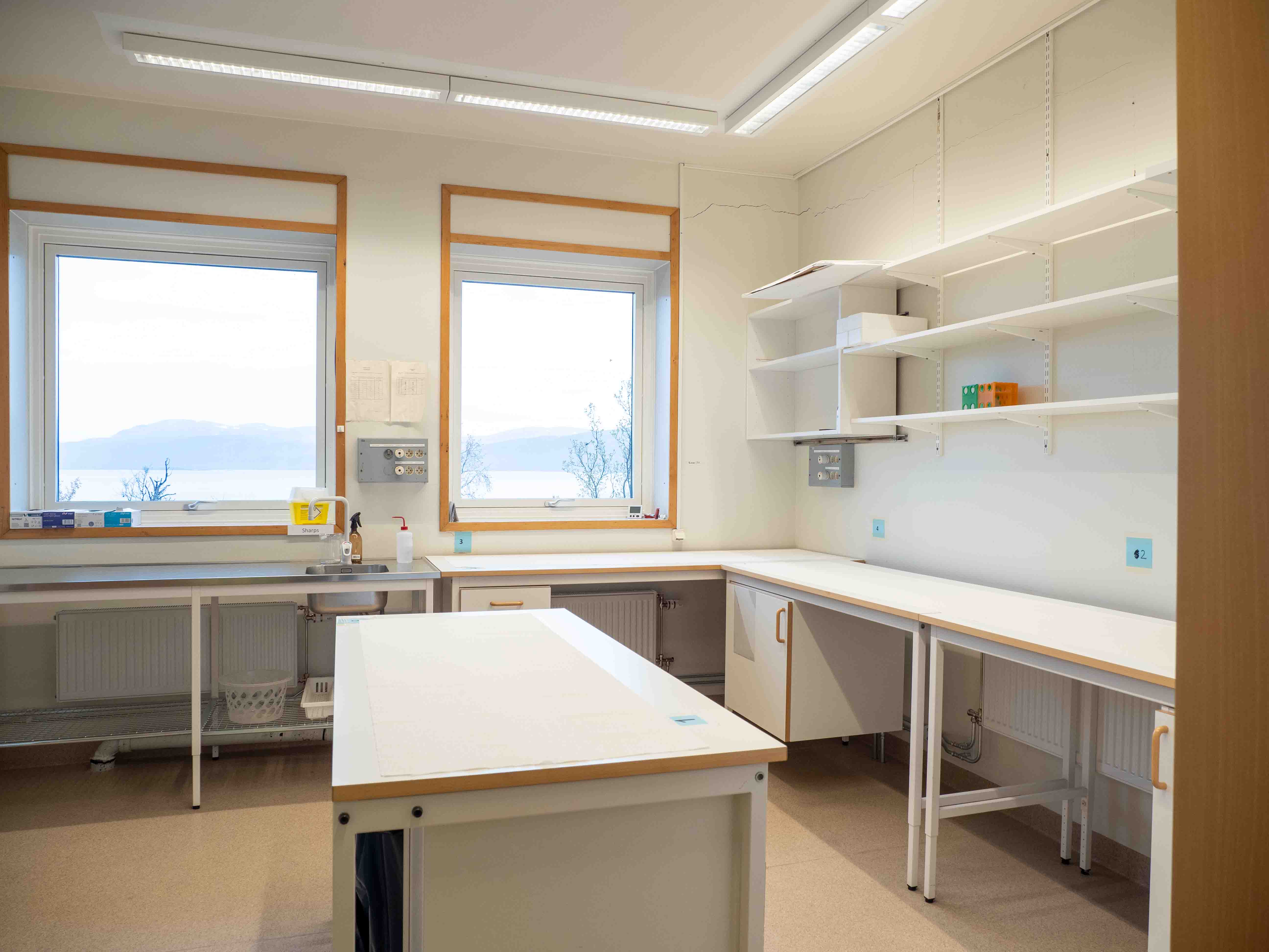 För arbete med preparerade prover av jord, växter och vatten. Det är ett medelstort laboratorium för biogeokemiska arbeten. Lokalen har fyra arbetsbänkar, hyllor och skåp för förvaring av prover och utrustning. I detta rum finns två diskbänkar – en diskbänk och en utslagsho.