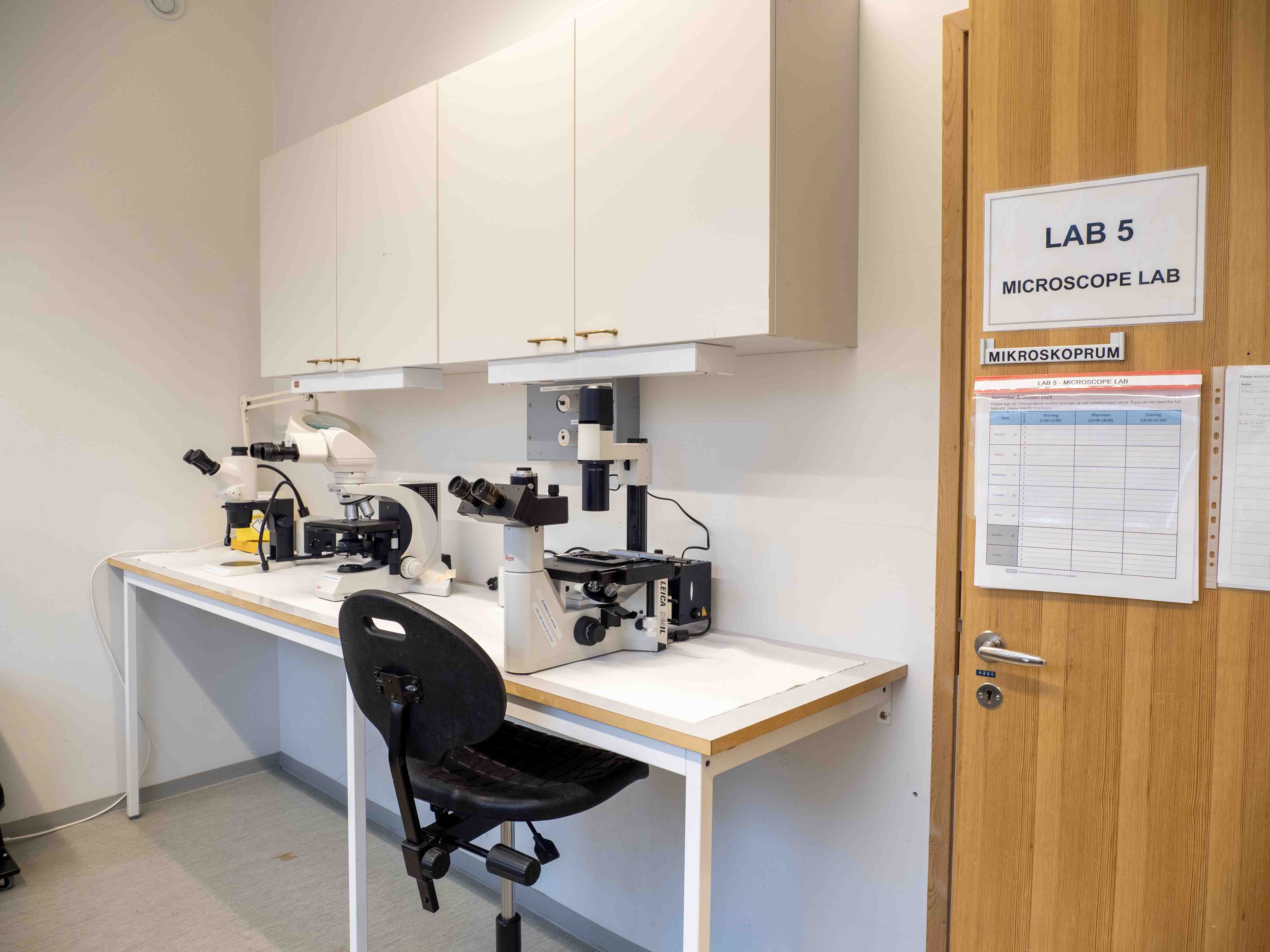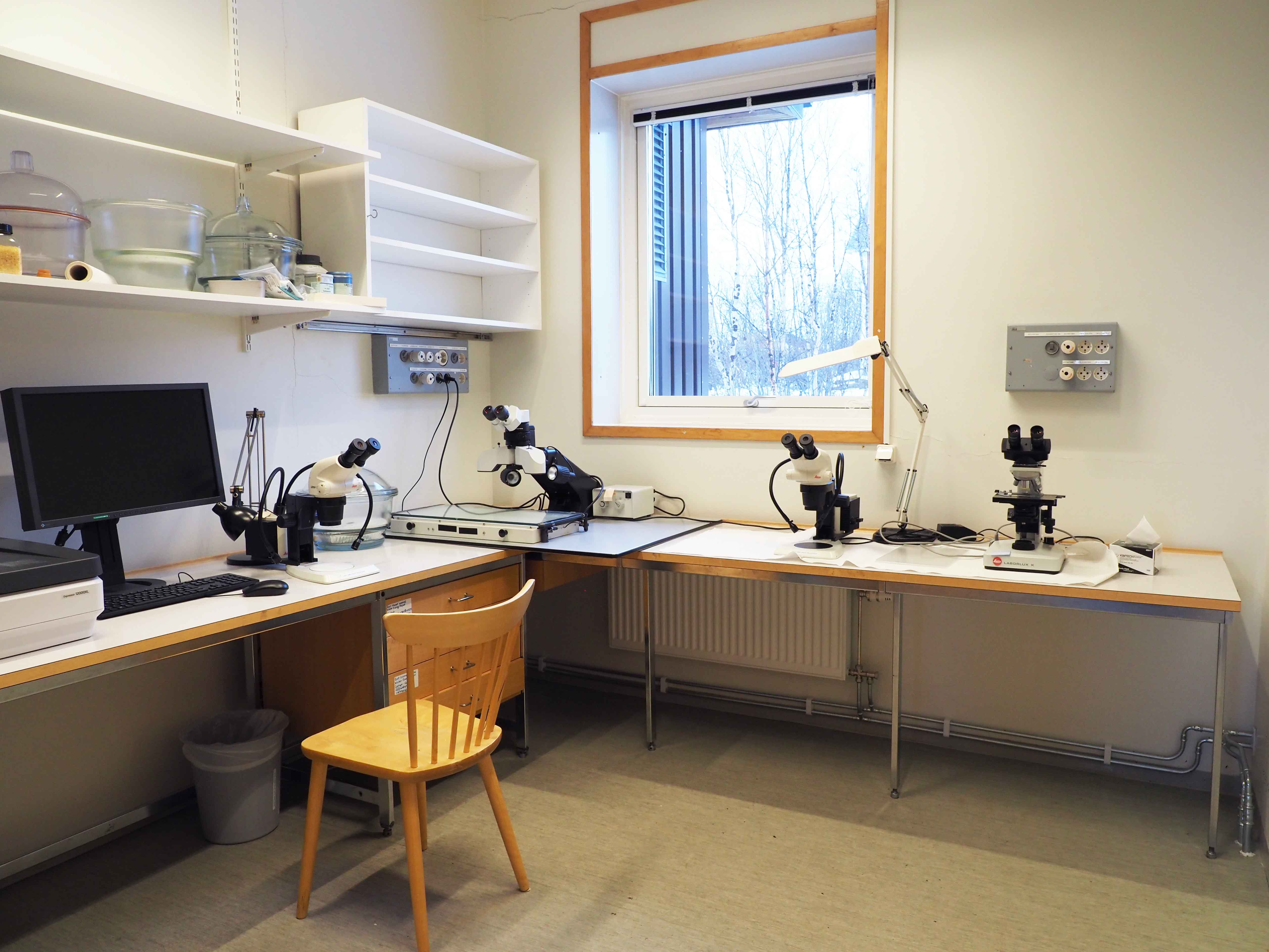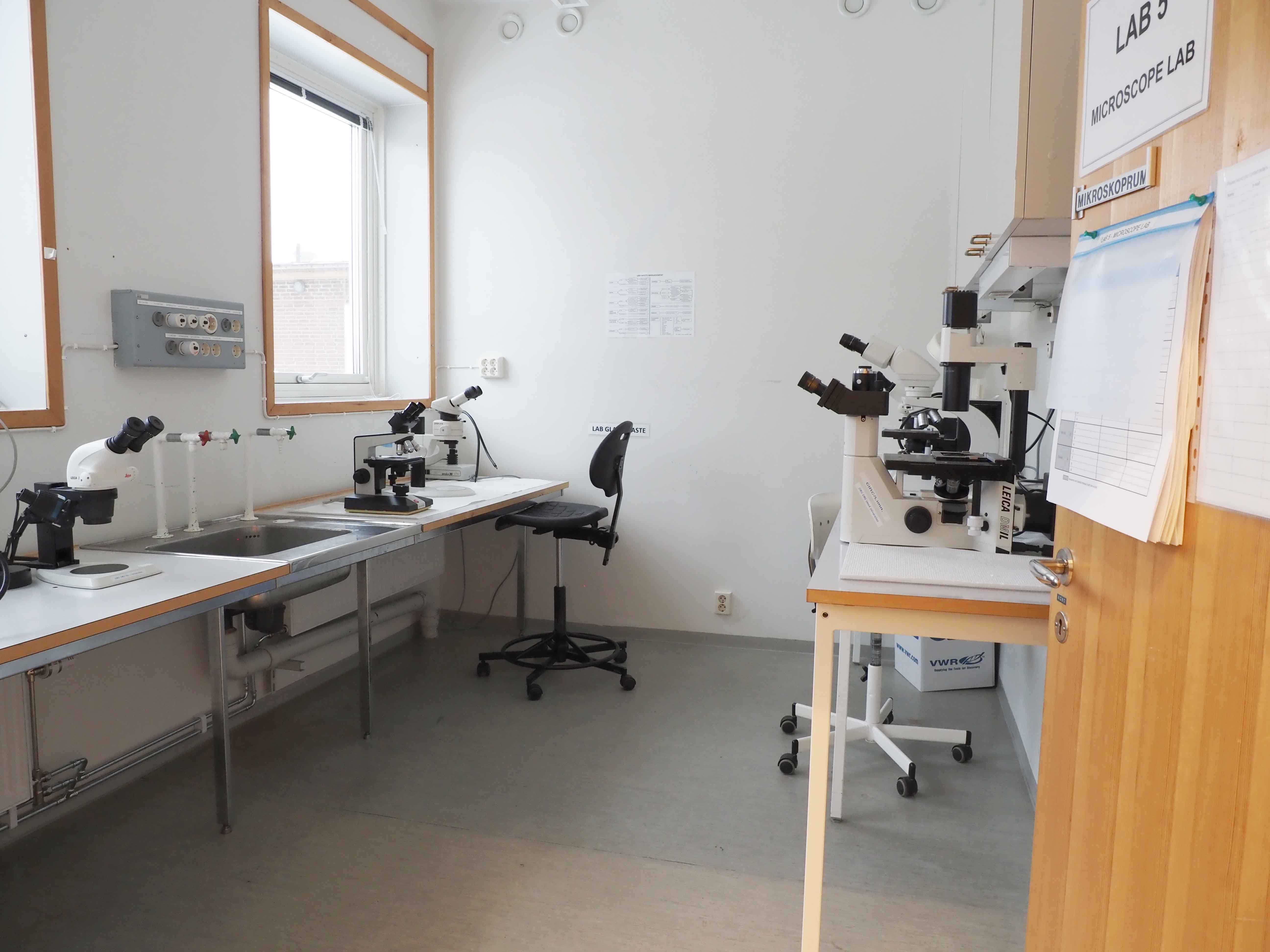 Dessa laboratorieutrymmen är avsedda för olika mikroskopering. Utrymmet kan även användas för preparering av prover. I rummet finns även en scanner ansedd för avbildning av rötter som får användas efter tillstånd från CIRC koordinatorer. Dessutom finns exsickatorer i olika storlekar, objektivglas och täckglas för mikroskopi samt nålar för materialfixering. Det finns en diskbänk med vattenkran.